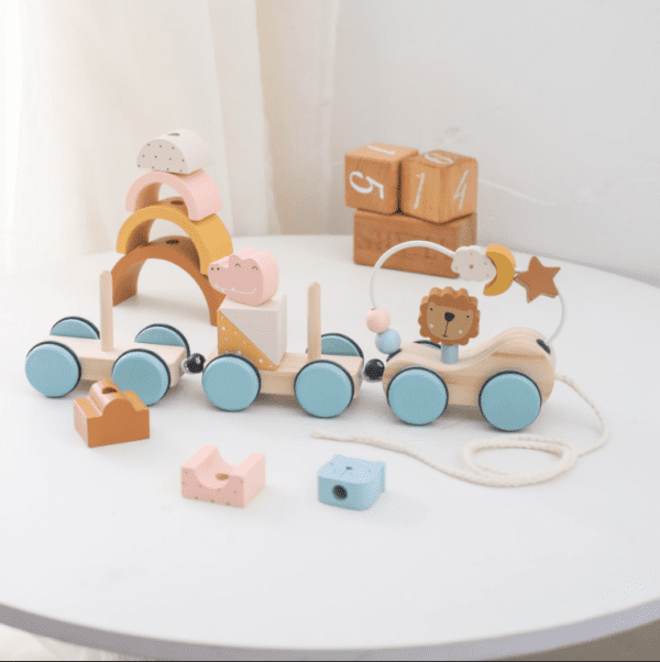 Tökéletes a finommotoros készségek fejlesztésére: Ez a fából készült játékvonat ideális eszköz a gyerekek számára a menetfűzés, az egyensúlyozás és a rakosgatás gyakorlására, elősegítve finommotorikus készségeiket és kognitív fejlődésüket.